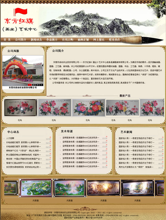 東莞市活動實業(yè)投資有限公司----東方紅旗(畫業(yè))藝術(shù)中心前身是康隆裝飾有限公司,為滿足市場的需求,逐步接觸油畫、國畫、工藝畫、裝飾畫。本公司經(jīng)營面積1200平方米,經(jīng)營范圍各種題材油畫、國畫、書法、工藝畫、刺繡、十字繡、框架、鏡框、定制肖像、酒店配畫,公司、辦公室配畫,美術(shù)培訓(xùn)。公司立足于文化產(chǎn)業(yè)的開發(fā),以弘揚(yáng)我國傳統(tǒng)文化藝術(shù)、促進(jìn)書畫藝術(shù)市場的繁榮和規(guī)范為經(jīng)營宗旨,推薦中青年藝術(shù)家,培育收藏群體,竭誠服務(wù)社會。畫廊的經(jīng)營者堅持以“誠信”為經(jīng)營宗旨、以“求真”為經(jīng)營理念。力求營造一個高品位、重信譽(yù)的藝術(shù)品交流環(huán)境。